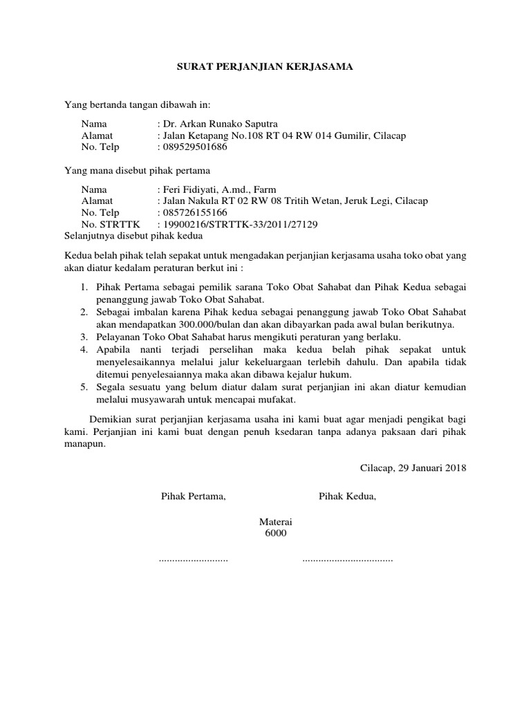 50.000.000,00 (lima puluh juta rupiah) kepada pihak pertama untuk usaha peternakan dan pembiakan ikan lele. Dengan adanya contoh, maka anda bisa contoh surat perjanjian kerjasama usaha perorangan. Berikut contoh langsung dari surat perjanjian kerjasama antara dua pihak. Kedua belah pihak menyatakan setuju untuk melaksanakan kerjasama usaha ini sejak kesepakatan di buat dan sampai 10 tahun ke depan. Perjanjian kerja sama pemasaran barang.